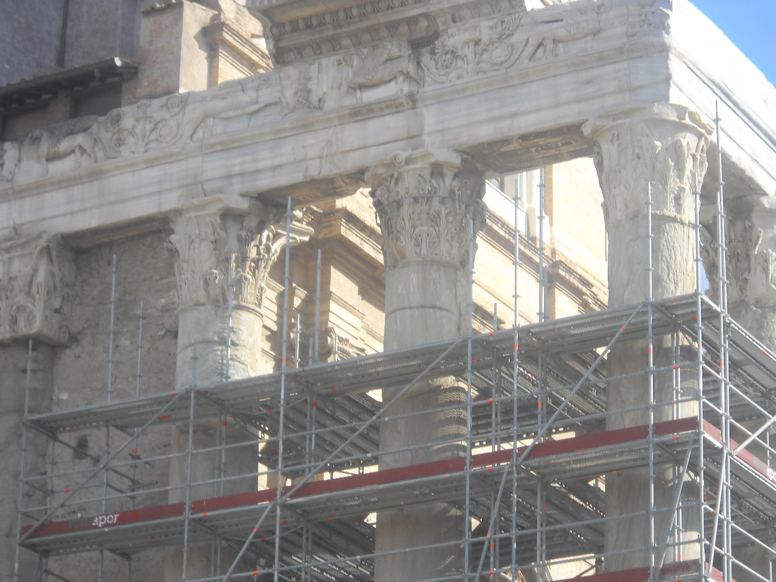 The marble the temple is made out of was very valuable stuff in the Renaissance. People attempted to cut down the columns by sawing through them with ropes dipped in acid. You can still see the rope marks. They were, fortunately, unsuccessful, largely because the acid ate through the ropes faster than the marble...